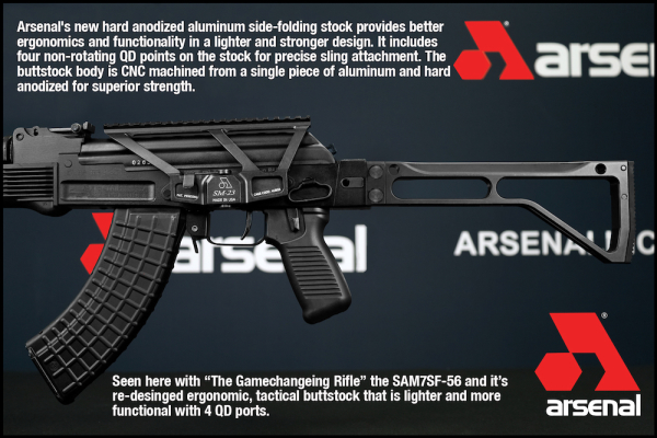 Arsenal's new hard anodized aluminum side-folding stock provides better ergonomics and functionality in a lighter and stronger design. It includes four non-rotating QD points on the stock for precise sling attachment. The buttstock body is CNC machined from a single piece of aluminum and hard anodized for strength. The attachment parts are heat treated carbon steel. The stock has a cheek weld groove machined for a better fit. All the parts are machined in house, down to the rivets which are produced in a CNC machine to ensure a flush fit. The attention to detail and manufacturing the parts in house has produced a high quality stock with tight tolerances, that's built to last.