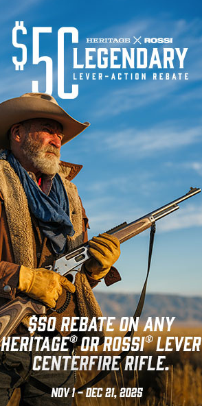 Just in time for the holidays, Heritage® and Rossi® are making it the perfect season to saddle up and save. With the new Heritage x Rossi $50 Legendary Lever-Action Rebate, customers can get $50 back on the purchase of any qualifying centerfire lever-action rifle now through December 21, 2025.
