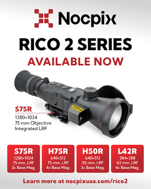 Additional features include a quick-detach mounting system, recoil-activated video, picture-in-picture mode, magnetic charging port, and a spare rechargeable battery. The larger S75R and H75R models feature a recoil-reducing mount for added durability, while the smaller L42R and H50R come equipped with a dual-locking Picatinny mount for maximum versatility. “The RICO 2 Series represents a new benchmark in thermal weapon sight technology,” said Henry Burge, Nocpix USA Director of Marketing. “With unmatched image quality, advanced ballistics integration, and rugged field-ready construction, these optics are designed to give hog and predator hunters the advantage they need.” With this launch, Nocpix continues its mission of delivering professional-grade performance backed by a 5-year warranty and 5-day turnaround guarantee. The RICO 2 Series is available online at nocpixusa.com and is currently shipping to iRayUSA (the US distributor of Nocpix thermal optics) dealers.