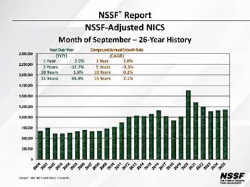 The September 2025 NSSF-adjusted National Instant Criminal Background Check System (NICS) figure of 1,179,424 is an increase of 2.0 percent compared to the September 2024 NSSF-adjusted NICS figure of 1,156,223. For comparison, the unadjusted September 2025 FBI NICS figure of 1,858,763 reflects a 10.3% percent decrease from the unadjusted FBI NICS figure of 2,072,550 in September 2024.