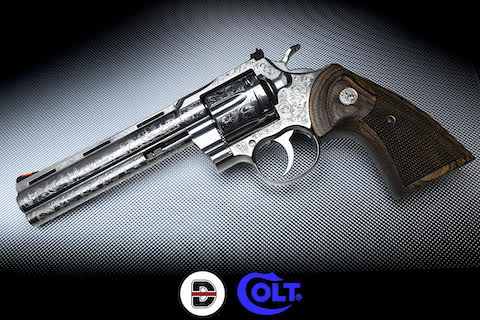 Davidson’s special edition engraved Colt Python begins as a standard stainless 6” barreled Python chambered in .357 Magnum with walnut grip, red-ramp front sight, and adjustable rear sight.